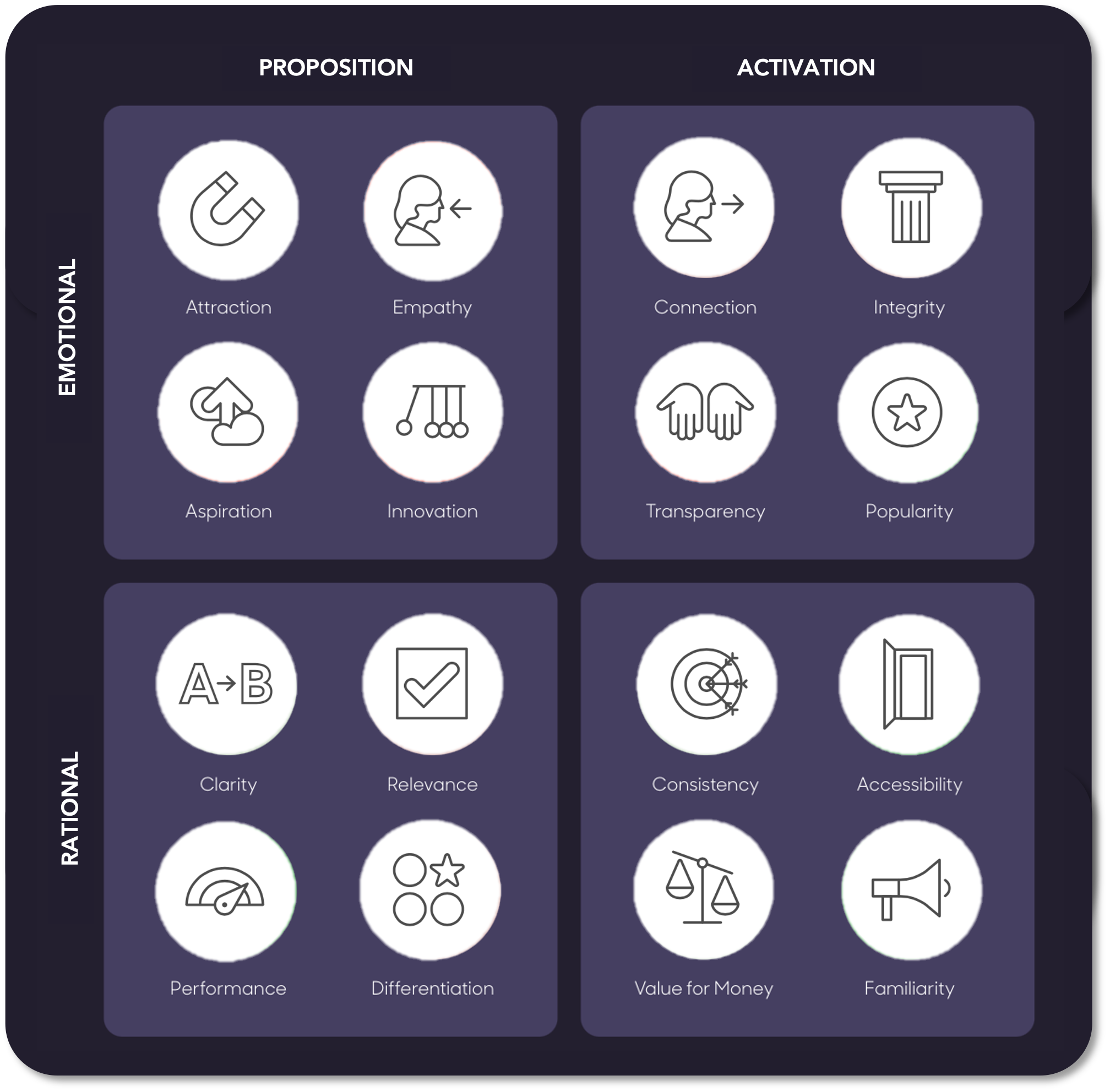 Over the last decade, Traction has identified 16 Drivers that collectively define the strength of a brand’s relationship with people. These Drivers reveal where a brand is performing, where competitors are winning and where growth opportunities lie.